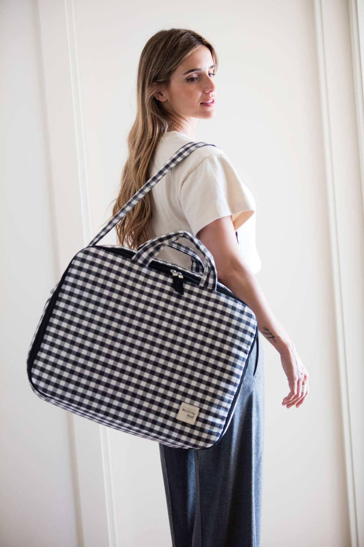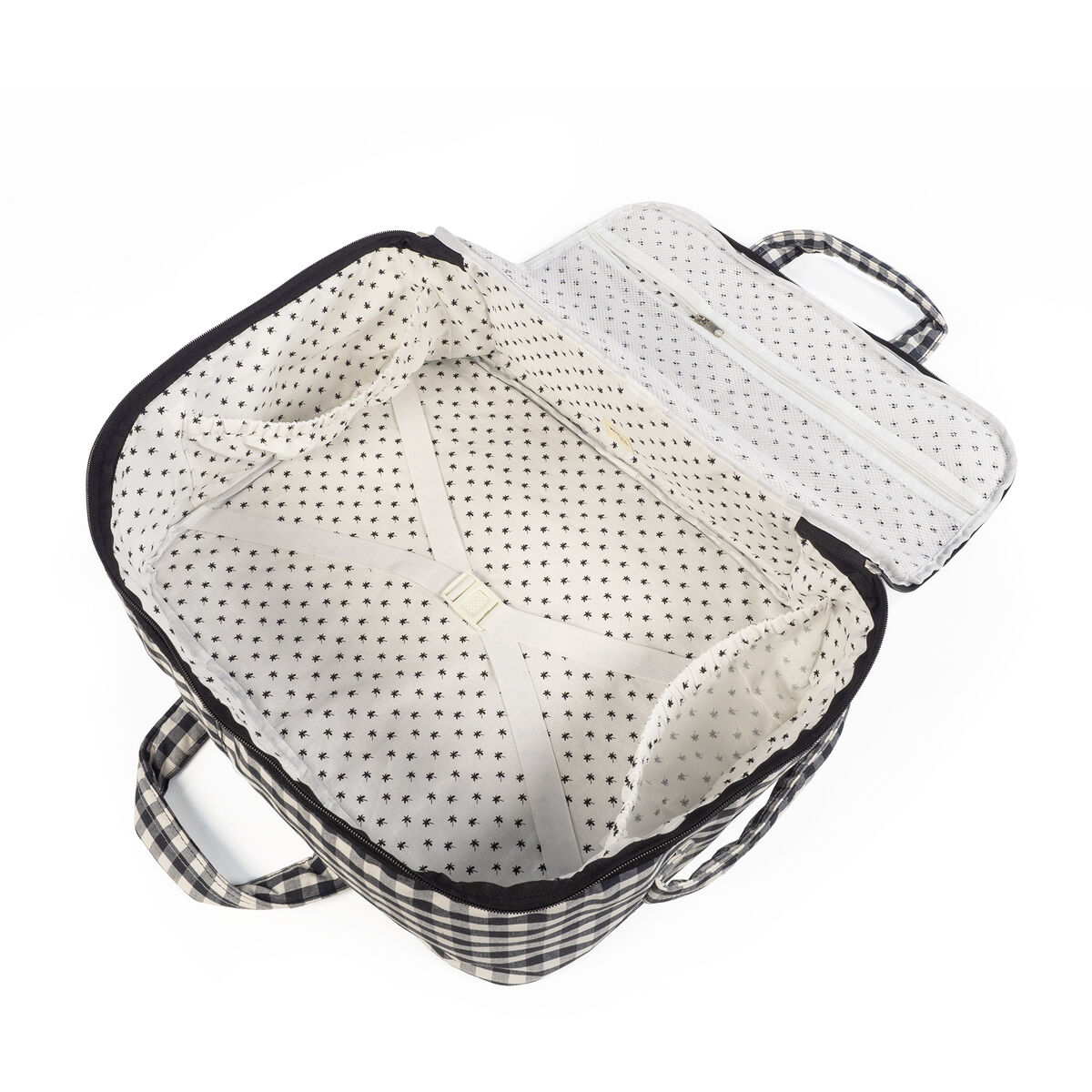 Cuenta con cierre seguro de cremallera en ambas direcciones que facilitan su apertura, incluye una correa larga para llevar colgada en el hombro y asas cortas de mano. Además en el compartimiento interior tiene un forro a juego con gomas para contener la ropa y mantener todo en su lugar.